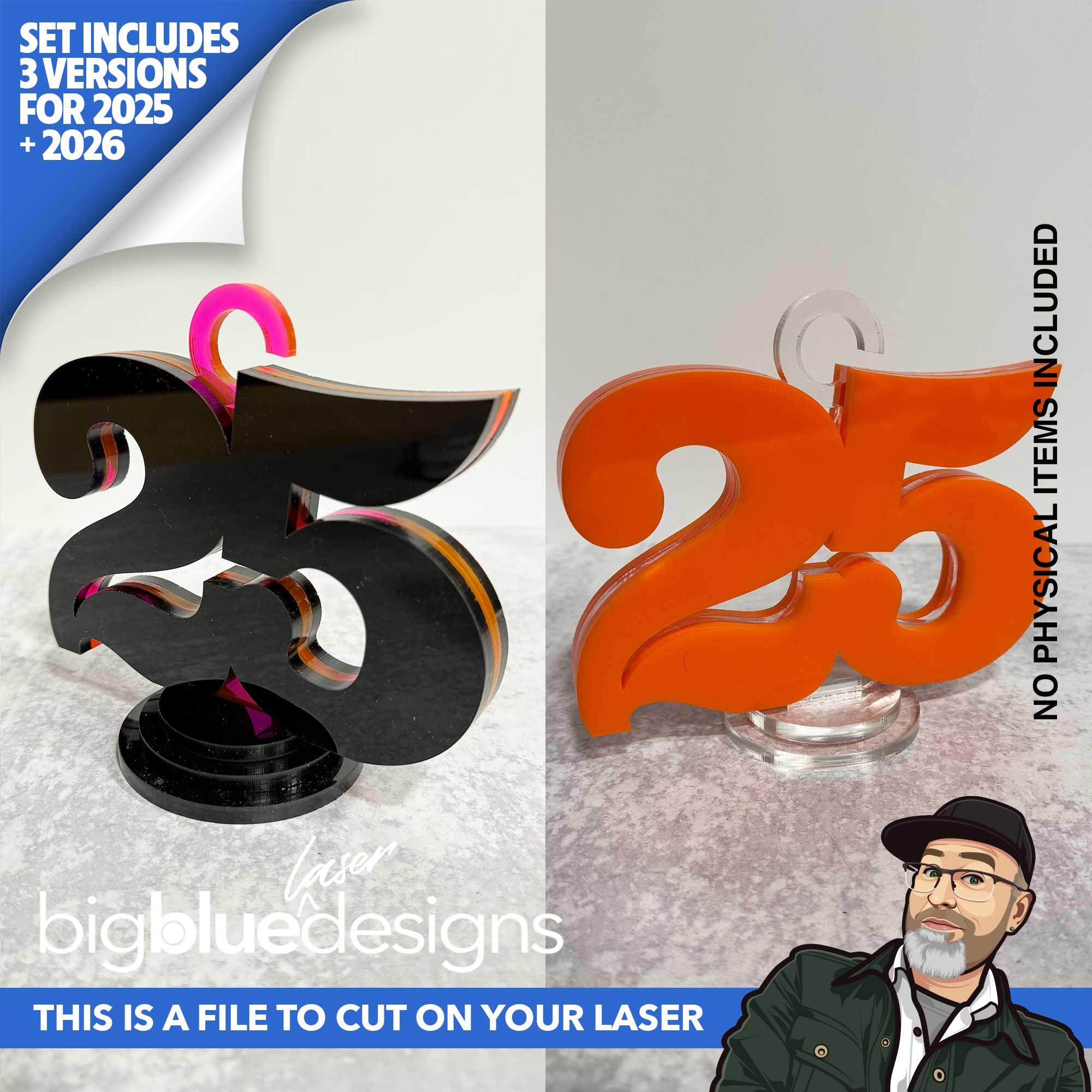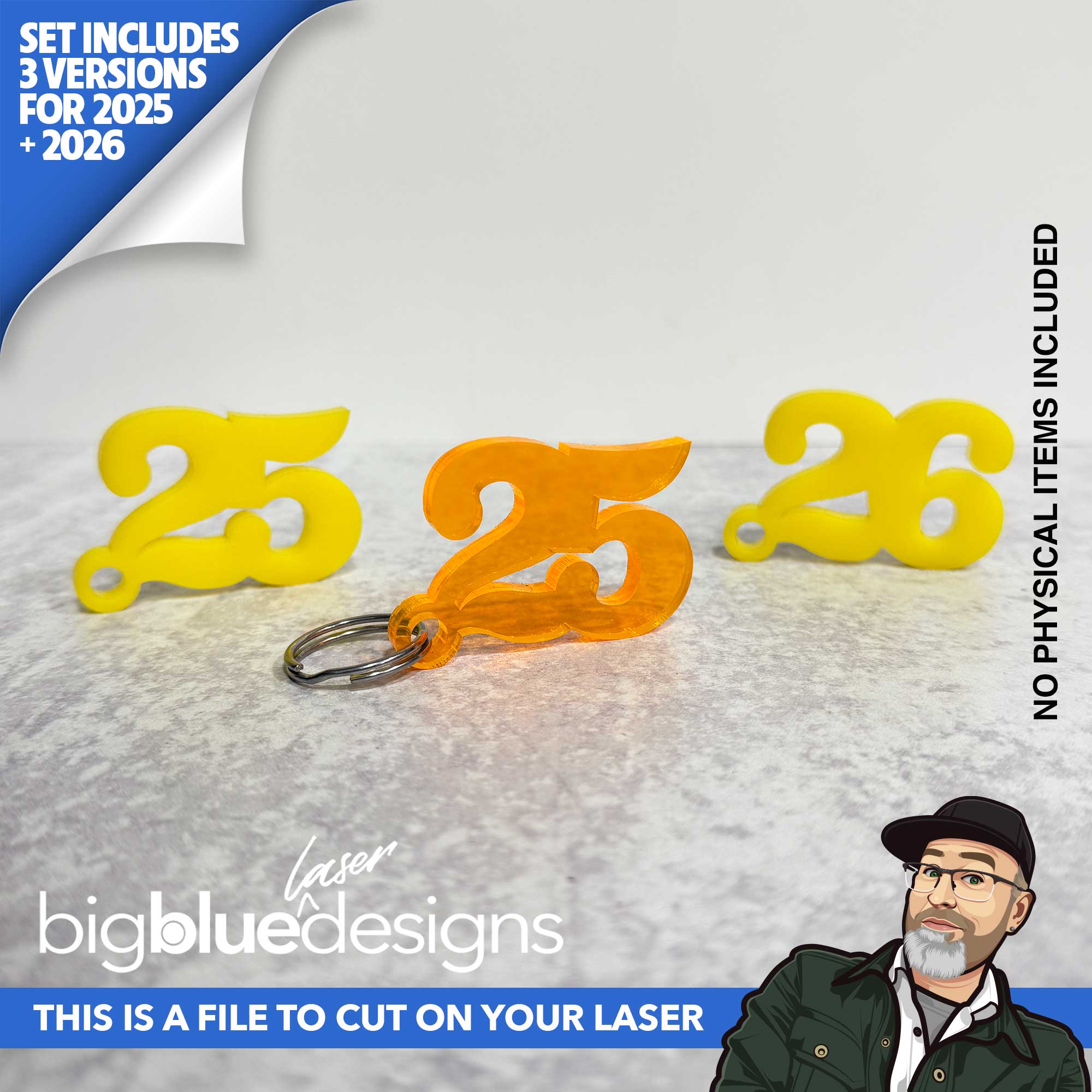 This set has 3 different sign/centerpiece designs, each with 2 loop hook options and 1 with no hook. Then it also has a 25 and 26 keychain design included as well.